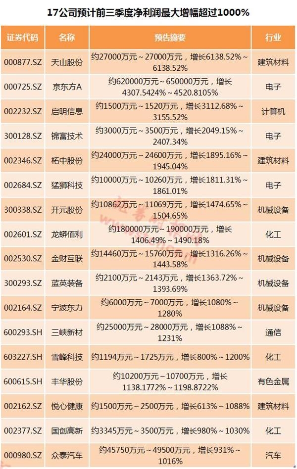 上市公司三季度业绩预告全透视:17股预增超10倍